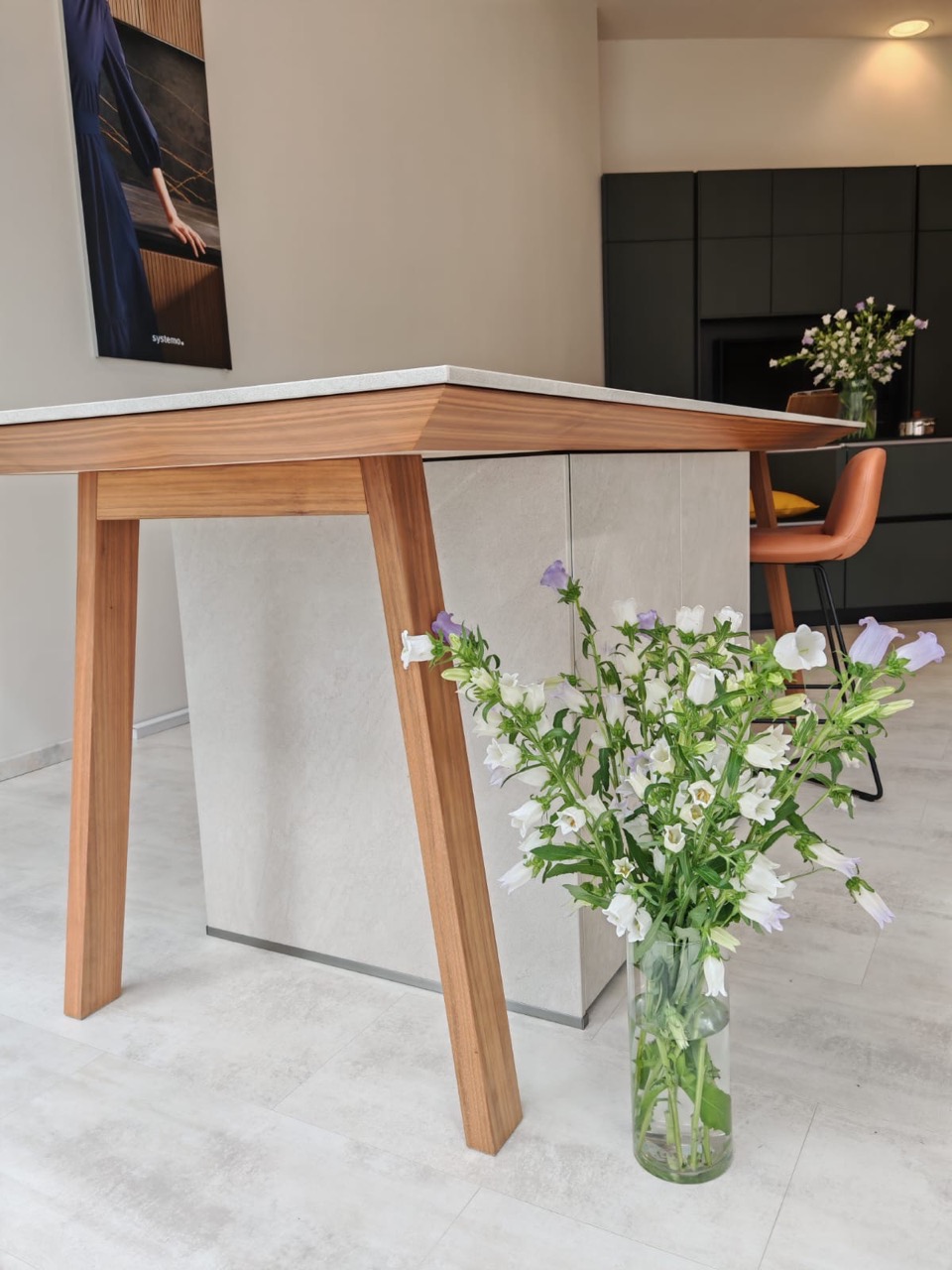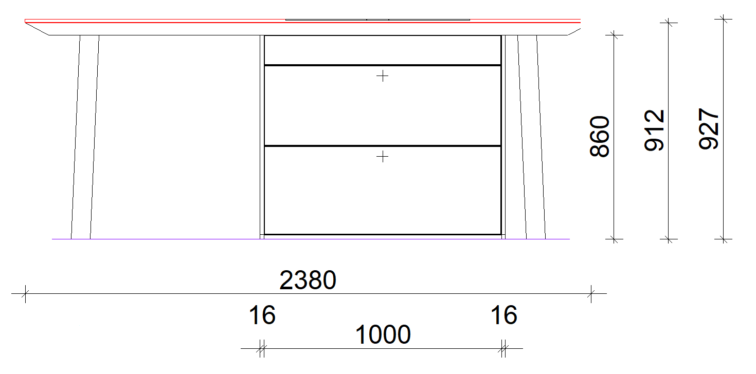 Izveden je od Bianco keramike debljine 15 mm na radnoj površini, frontama i bočnim stranicama elementa. Drvena konstrukcija izvedena je od masiva oraha.